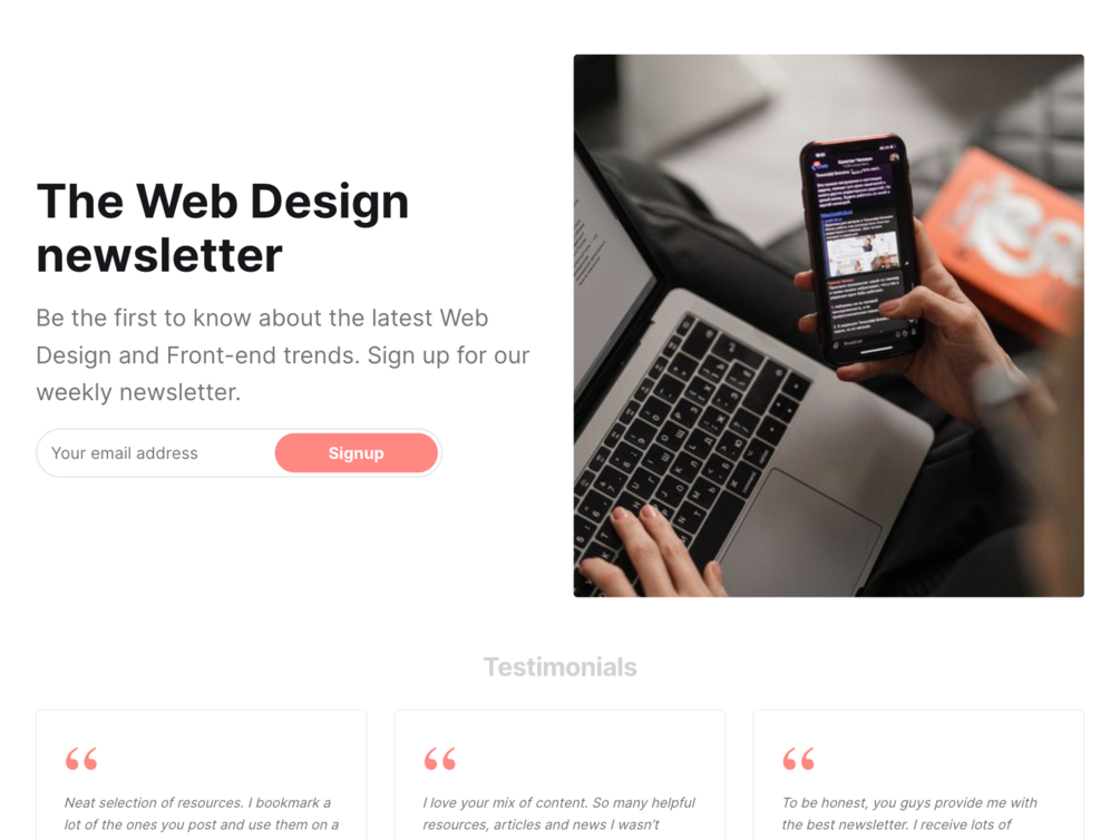 The goal of a newsletter landing page is to get visitors to sign up for your email newsletter. This template will help with that, using proven strategies: highly visible CTA, social proof, and eliminating distractions.